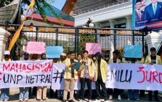 Puluhan Mahasiswa Universitas Negeri Padang mendeklarasikan komitmen pemilu damai di depan Kantor DPRD Sumbar, Senin (12/02/2024). Puluhan mahasiswa dari UNP melakukan...