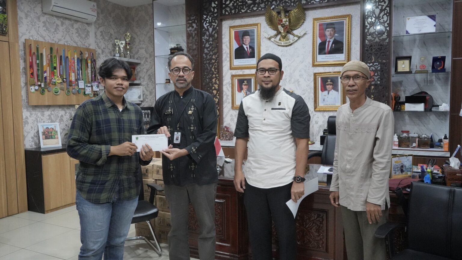 Dalam penyerahan santunan tersebut Sekwan Maifrizon didampingi Kabag Umum Udlil Iman Zul dan Bendahara Masjid Asy Syura DPRD Sumbar Agus.