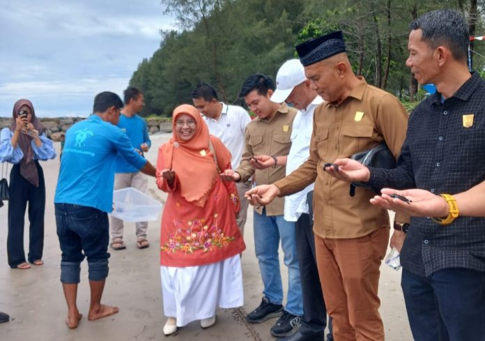Dalam kunjungan itu pimpinan dan anggota Komisi II turut diajak oleh Kepala UPTD, Wandi Afrizal melakukan rilis tukik ke laut lepas.