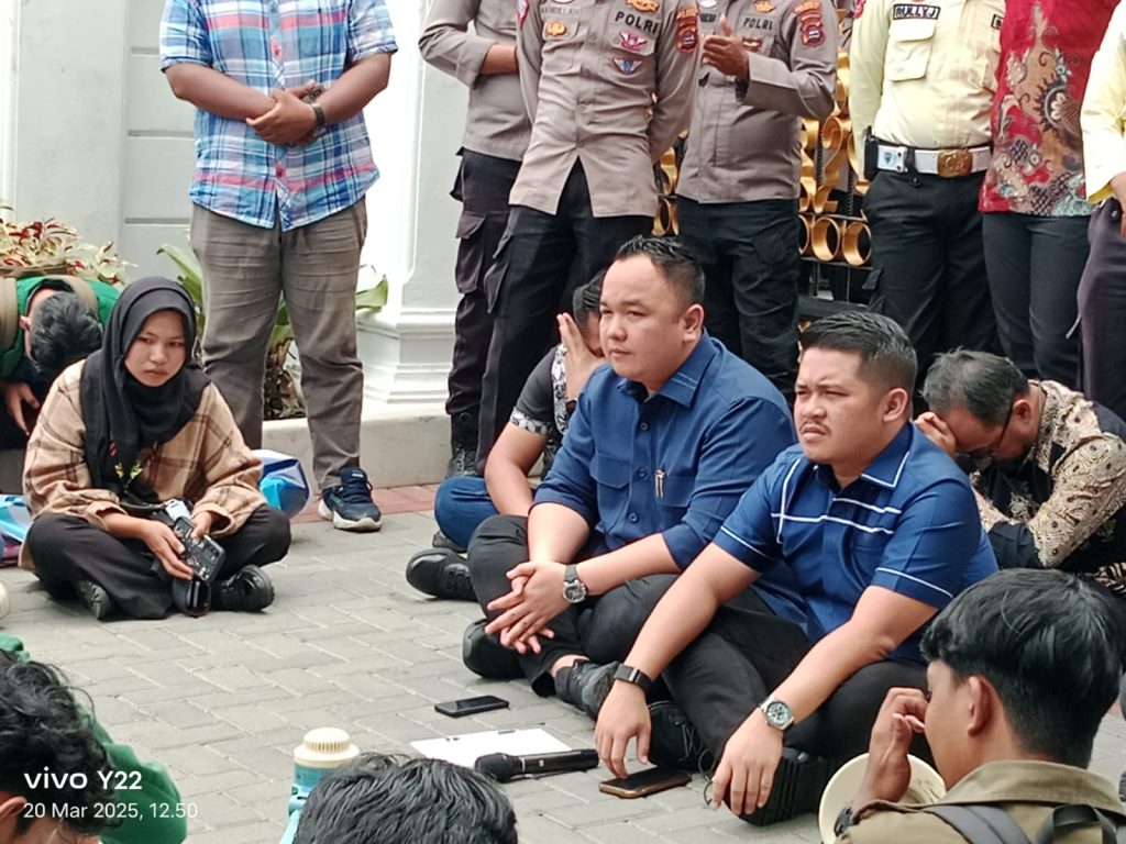 Dua Pimpinan DPRD Provinsi Sumatera Barat, Muhammad Iqra Chissa dan Nanda Satria menerima pengunjuk rasa dari Koalisi Masyarakat Sipil Sumatera Barat ke DPRD Provinsi Sumatera Barat, Rabu (20/3/2025).
