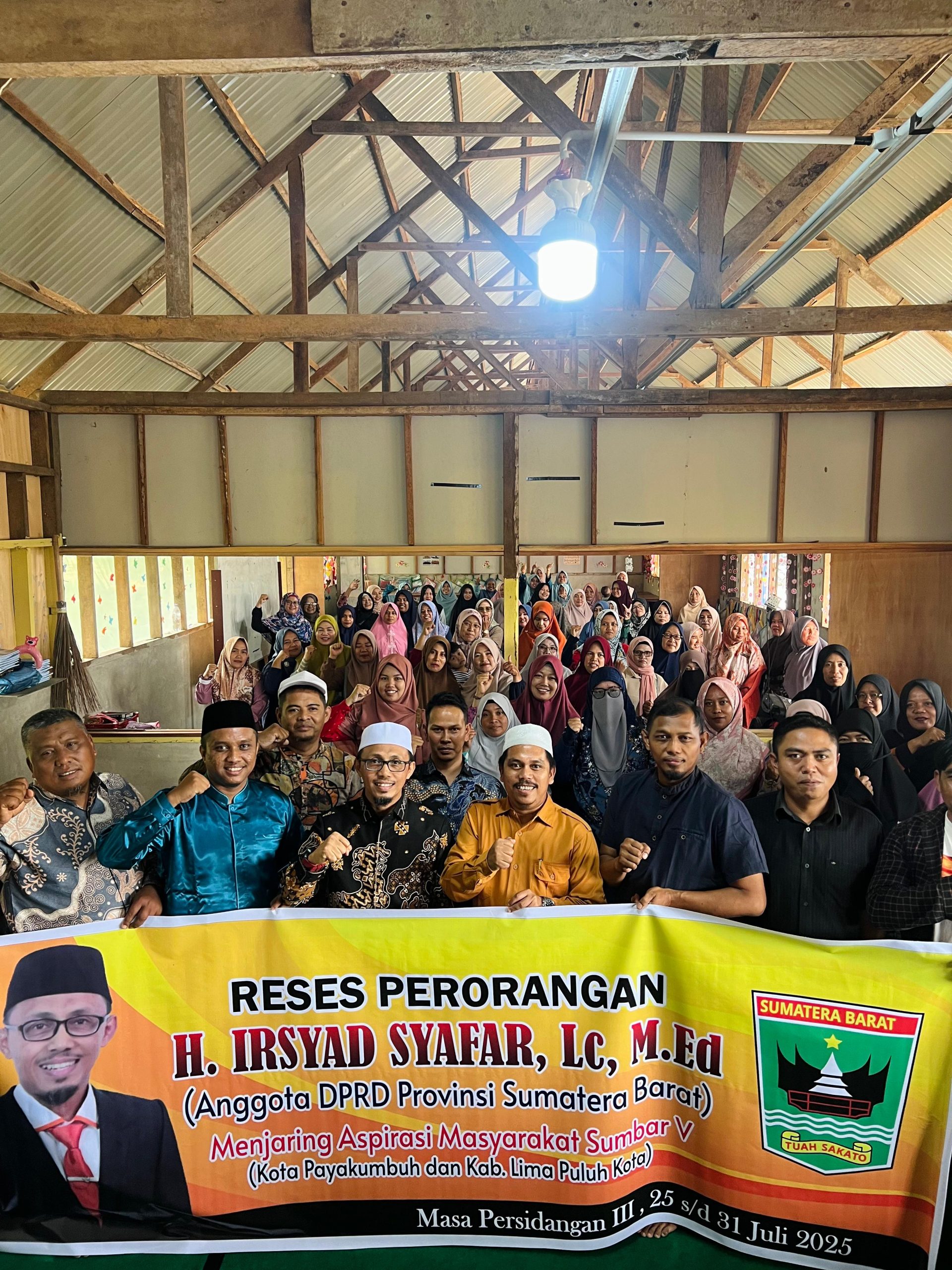 Anggota DPRD Provinsi Sumatera Barat, Irsyad Syafar, menyerap beragam aspirasi masyarakat saat menggelar kegiatan reses perseorangan masa sidang ketiga Tahun 2025-2026, Sabtu (26/7), di SD IT AR Risalah, Nagari Simalanggang, Kabupaten Lima Puluh Kota.